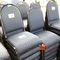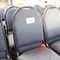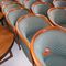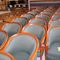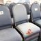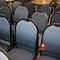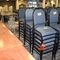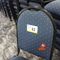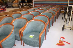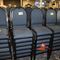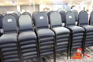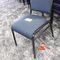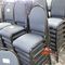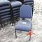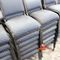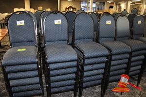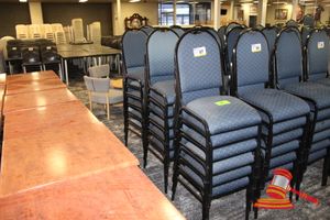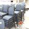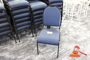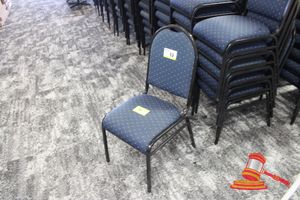 49 X HIGH BACK DINING CHAIRS. PADDED FABRIC SEATS (BLUE) AND BACKREST WITH BLACK METAL FRAMES. STACKABLE. NORMAL WEAR AND TEAR. SOME FABRIC SUN DAMAGED