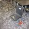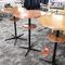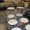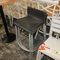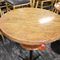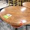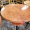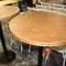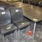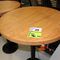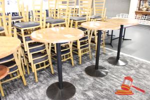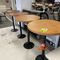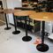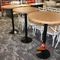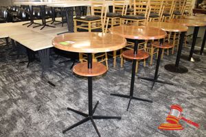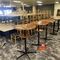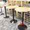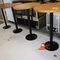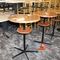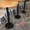 4 X COMMERCIAL BAR TABLES. TIMBER GRAIN LOOK FIBERGLASS TOPS WITH HEAVY BLACK METAL BASES. SOME WEAR AND TEAR, MARKS.