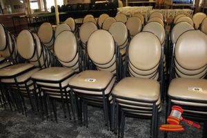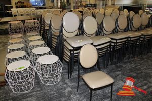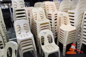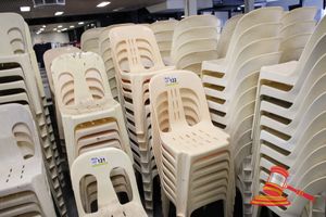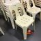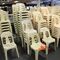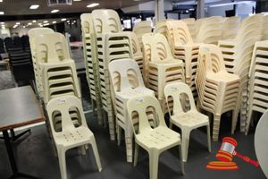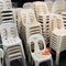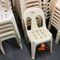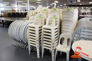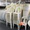APPROX 68 X OUTDOOR CHAIRS. CREAM. STACKABLE. POOR/AVERAGE CONDITION. SOME MARKS/SCRATCHES/SUN DAMAGE. INSPECTION RECOMMENDED