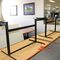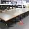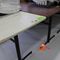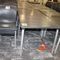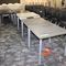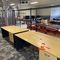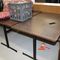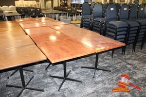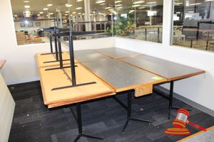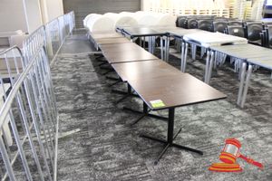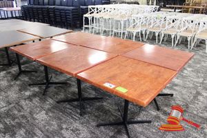 8 X DINING TABLES. TIMBER TOP WITH LEATHER LOOK INSERT AND METAL LEGS. APPROX 1600 X 800MM. NORMAL WEAR AND TEAR. SOME MARKS/SCRATCHES