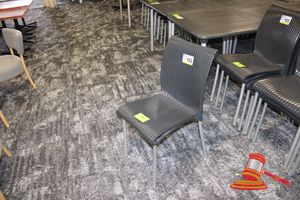 24 X CASUAL DINING/CAFE CHAIRS. BLACK VINYL PADDED SEATS WITH METAL FRAME. MINOR WEAR AND TEAR