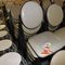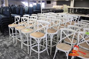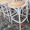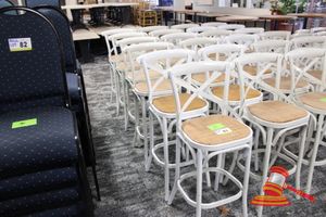 12 X BAR STOOLS. WHITE METAL FRAMES WITH RATTAN SEATS. FAIR/AVERAGE CONDITION. NORMAL WEAR AND TEAR. SOME MINOR MARKS/SCRATCHES/SUN DAMAGE. SOME MINOR CORROSION ON METAL FRAMES