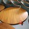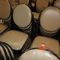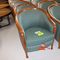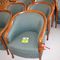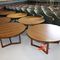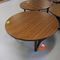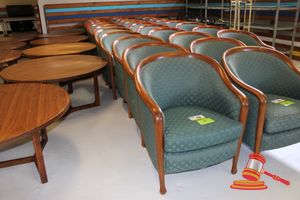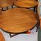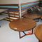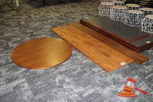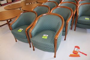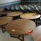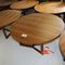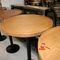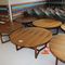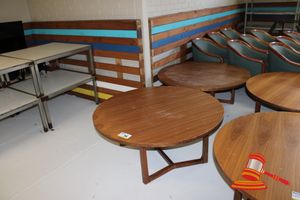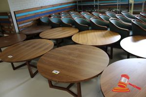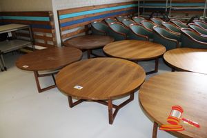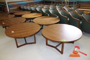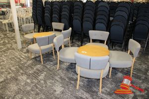 2 X OCCASIONAL COFFEE SETTINGS. EACH SETTING INCLUDES 1 X TIMBER COFFEE TABLE (DIAM 700MM X H450MM) AND 4 X GREY FABRIC PADDED SEATS. NORMAL WEAR AND TEAR. SOME MINOR MARKS/SCRATCHED/STAINS