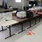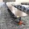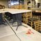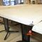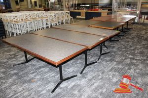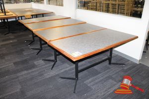 7 X DINING TABLES. TIMBER TOP WITH MARBLE LOOK INSERT AND METAL LEGS. APPROX 1600 X 800MM. 1 X LEG DAMAGED, 1 X TABLE TOP DAMAGED. NORMAL WEAR AND TEAR. SOME MARKS/SCRATCHES