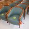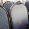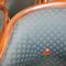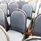 18 X HIGH BACK DINING CHAIRS. PADDED FABRIC SEATS (BLUE) AND BACKREST WITH BLACK METAL FRAMES. STACKABLE. NORMAL WEAR AND TEAR. SOME FABRIC SUN DAMAGED