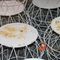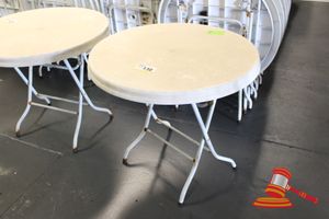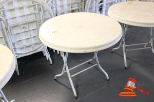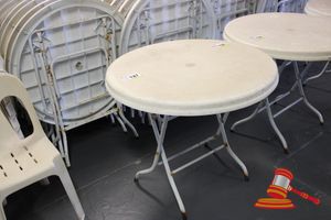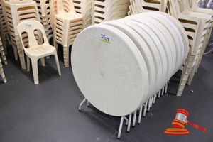 20 X OUTDOOR TABLES. WHITE. DIAM APPROX 900MM. FOLDABLE. POOR/AVERAGE CONDITION. SOME MARKS/SCRATCHES/CORROSION/SUN DAMAGE. INSPECTION RECOMMENDED