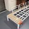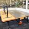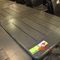 8 X NARDI OUTDOOR SQUARE PLASTIC CAFE TABLES. 900 X 900MM. DARK GREY. TIMBER SLAT LOOK. REMOVABLE LEGS FOR EASY TRANSPORT/STORAGE. INCLUDES 4 X SPARE TABLE TOPS (1 X NEW). NORMAL WEAR AND TEAR/SUN DAMAGED (FADED).