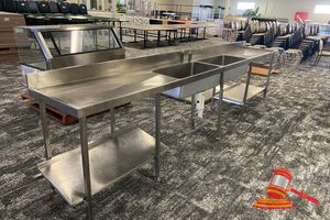 SIMPLY STAINLESS DISHWASHER, INLET BENCH WITH TROUGH, SPRAYER TAP, SPLASH BACK, UNDER SHELF POT RACK. FREE STANDING, APPROX 2100mm x 600mm x H900mm