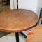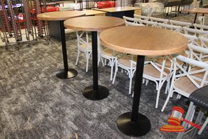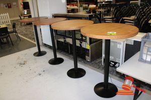 3X ROUND COMMERCIAL BAR TABLES. WOOD GRAIN LOOK TOP WITH HEAVY BLACK METAL BASES, DIAM 800MM, HEIGHT 1140MM. NORMAL WEAR AND TEAR