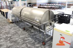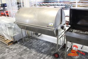 HEATLIE STAINLESS STEEL MOBILE LARGE ROASTING CABINET WITH STAINLESS STEEL RACK/SHELF ( NO ACCESSORIES). USED AS A "SMOKER" CABINET. LPG GAS. APPROX 1450 X 860 X H1400MM