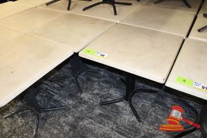 13 X SQUARE DINING/CAFE TABLES. 740 X 740MM. MARBLE LOOK TOP WITH METAL BASE. POOR/AVERAGE CONDITION. NORMAL WEAR AND TEAR. SOME MARKS/SCRATCHES/SUN DAMAGE. INSPECTION RECOMMENDED