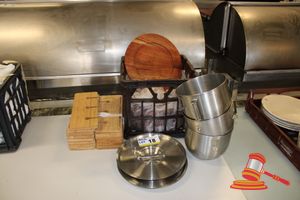 2 X POT LIDS (DIAM APPROX 300MM), 3 X ASSORTED MIXING BOWLS (DIAM APPROX 210 X H180MM), APPROX 10 X ANKO ACACIA WOOD CHARGER PLATES. DIAM APPROX 330MM, APPROX 14 X BAMBOO (3 X WINE GLASSES) SERVING TRAYS. APPROX 360 X 160MM