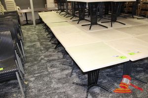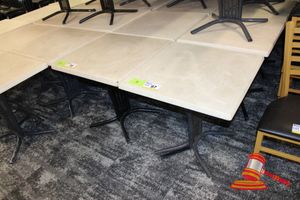 12 X SQUARE DINING/CAFE TABLES. 740 X 740MM. MARBLE LOOK TOP WITH METAL BASE. POOR/AVERAGE CONDITION. NORMAL WEAR AND TEAR. SOME MARKS/SCRATCHES/SUN DAMAGE. INSPECTION RECOMMENDED