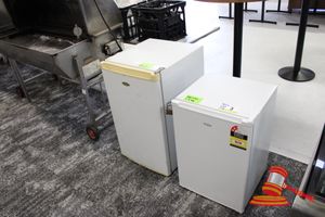 2 X HAIER BAR FRIDGES. WHITE. 1 - 480 X 440 X H700 (SASH LOCK), 1 - 500 X 560 X H630MM (NO SHELVES)