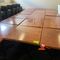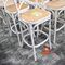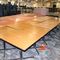 12 X SQUARE DINING/CAFE TABLES. 740 X 740MM. LIGHT TIMBER GRAIN LOOK TOP WITH METAL BASE. NORMAL WEAR AND TEAR. MARKS/SCRATCHES