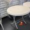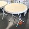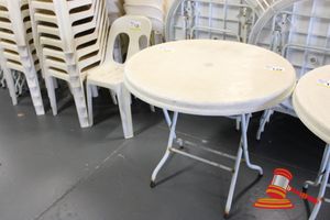 25 X OUTDOOR TABLES. WHITE. DIAM APPROX 900MM. FOLDABLE. POOR/AVERAGE CONDITION. SOME MARKS/SCRATCHES/CORROSION/SUN DAMAGE. INSPECTION RECOMMENDED