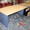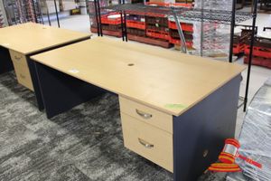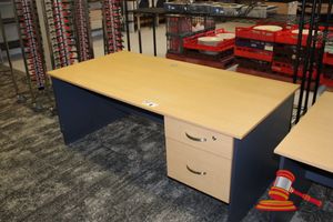 OFFICE DESK WITH DRAWERS. TIMBER GRAIN LOOK. APPROX 1800 X 900MM. SOME MINOR DAMAGE ON BOTTOM OF BASE. NORMAL WEAR AND TEAR