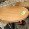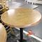 3 X ROUND COMMERCIAL BAR TABLES. WOODGRAIN LOOK FIBERGLASS TOP WITH BLACK METAL BASES, DIAM 800MM, HEIGHT 1140MM. MINOR WEAR AND TEAR. 1 SMALL HOLE ON 1 TABLE TOP
