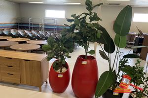 3 X ASSORTED GLAZED POTS ( HEIGHTS 820 - 1000MM) WITH ASSORTED ARTIFICIAL PLANTS (HEIGHT UPTO 2000MM)