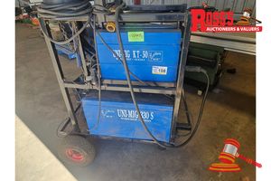 UNIMIG MIG WELDER WITH MTR REMOTE CONTROLLER MOUNTED ON HEAVY DUTY MOBILE TROLLEY, 330AMP MODEL#330S CONTROLLER IS KT50 REMOTE